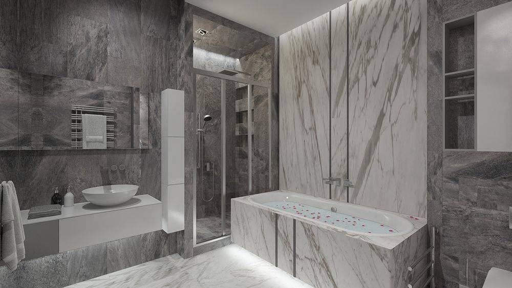 Мраморная ванна — очень прочная и элегантная, подходит для очень просторной, современной и роскошной ванной комнаты.