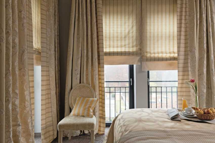 - Шторы в узкой спальне – элемент не обязательный. Но если и использовать их, то рекомендуется выбирать светлые, из лёгких тканей. Идеальный выход – жалюзи, римские или рулонные занавески.