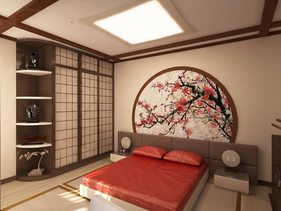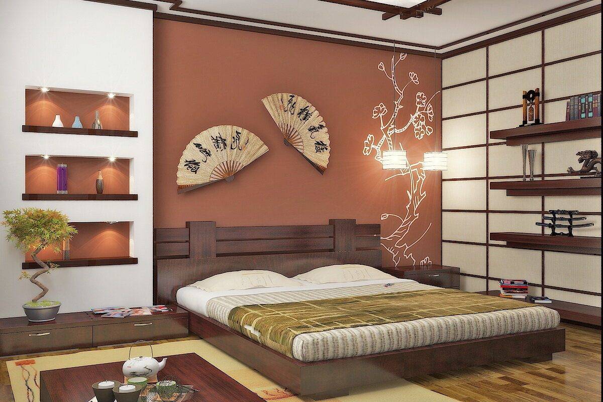 - Декор. В японской спальне тем места вычурным и ярким аксессуарам, на стены можно повесить большие веера, циновки с рисунками, картины. Можно расставить бонсай, икебаны, японские фигурки.