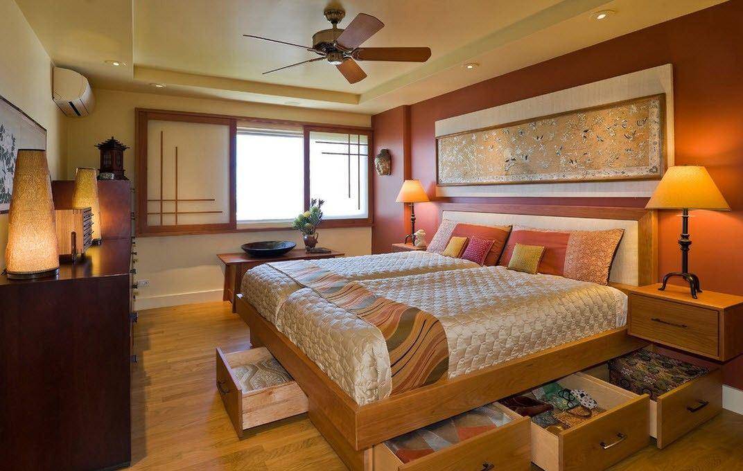 — в интерьере маленькой спальни в японском стиле должны преобладать светлые цвета