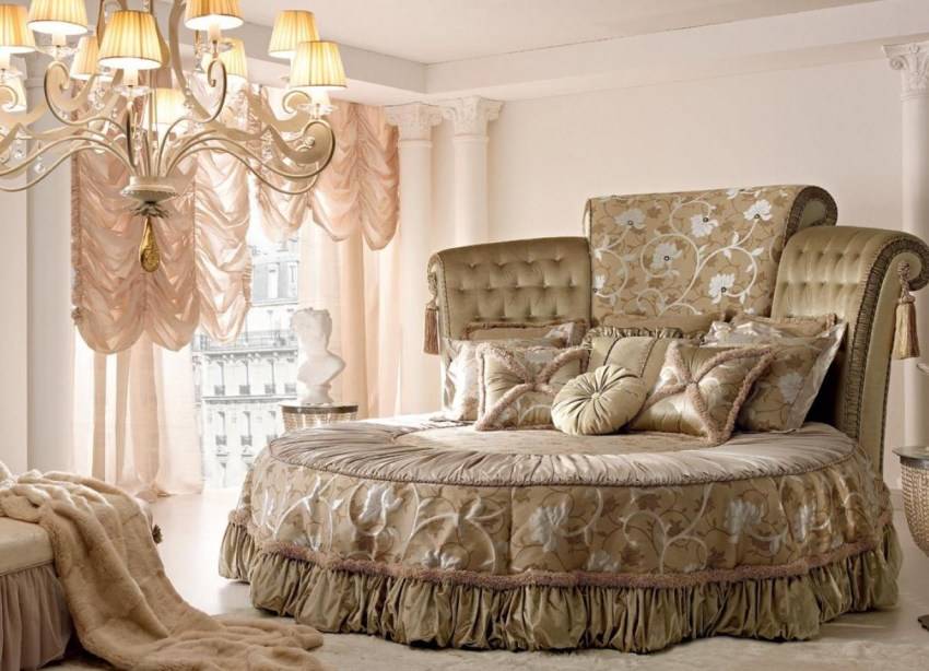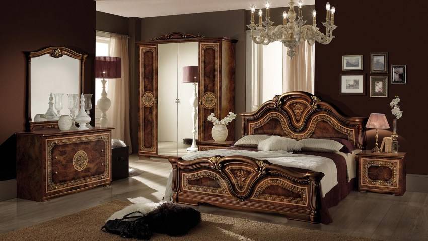 В классическом дизайне нет разрозненных предметов интерьера. При оформлении берут элементы из одного комплекта. Центральную часть комнаты занимает кровать. Массивное ложе с резным (мягким) изголовьем и с изогнутыми ножками дополняет позолота или кованые детали. Над зоной сна монтируют балдахин из полупрозрачного тюля или роскошных плотных драпировок.