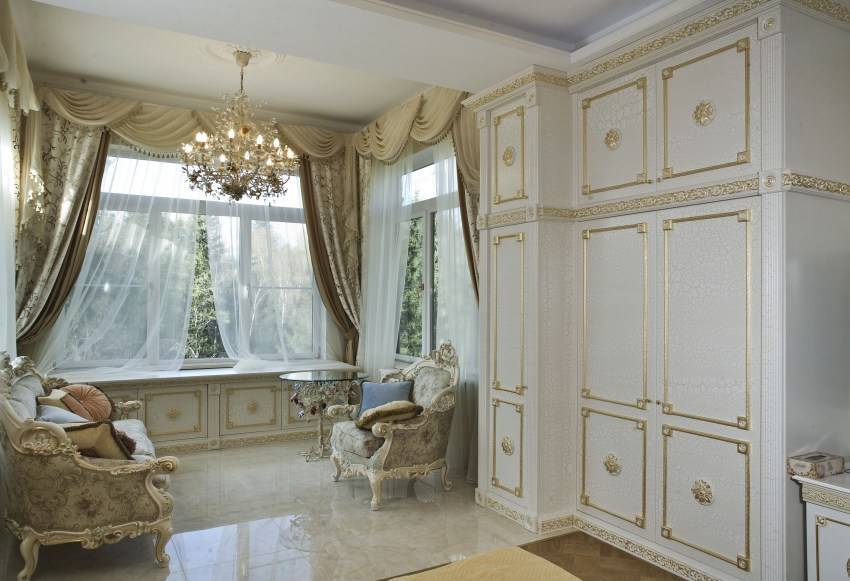 - Большие шкафа, комоды, серванты, с дорогим текстилем и позолотой.