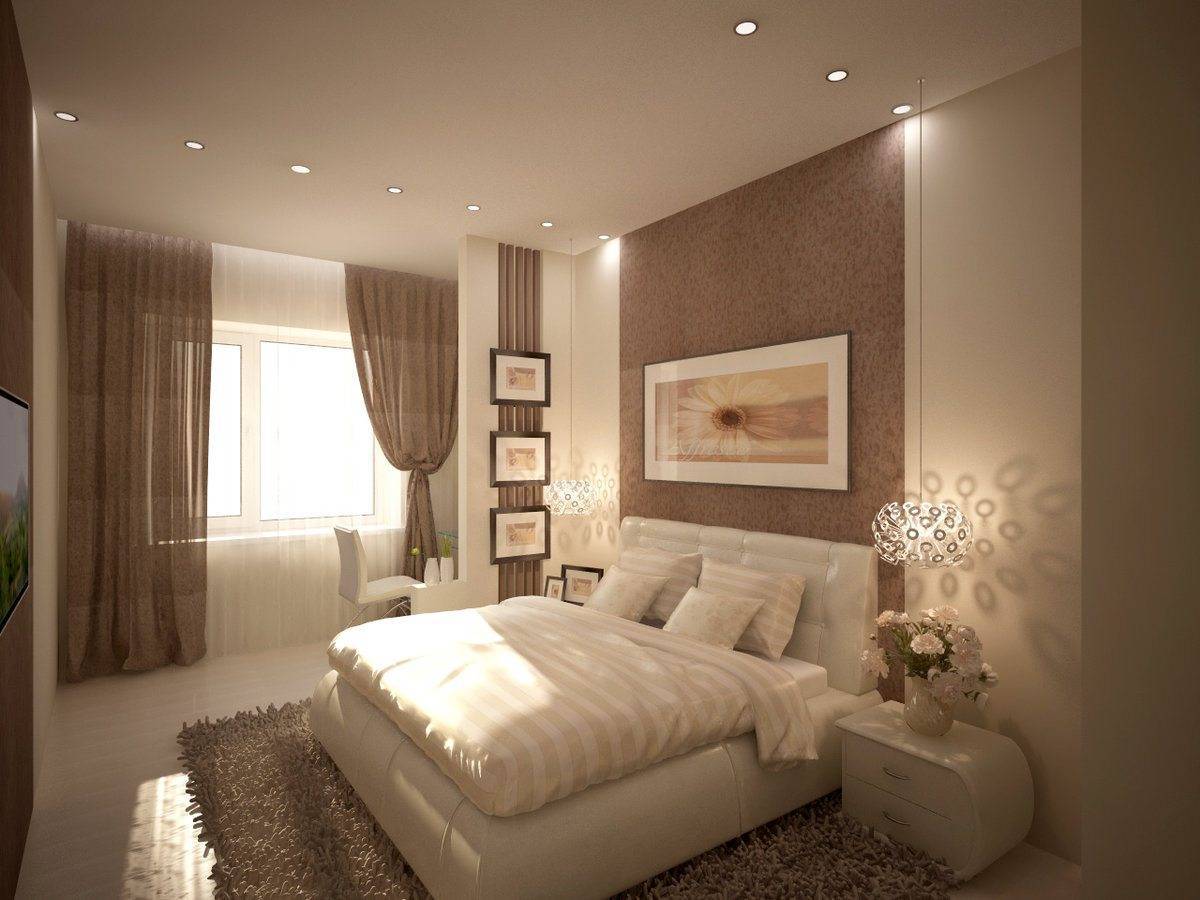 Бежево-коричневая палитра идеально подходит для спальни. Такой дизайн оказывает успокаивающее действие на психику, не приедается и прекрасно смотрится в любом направлении.