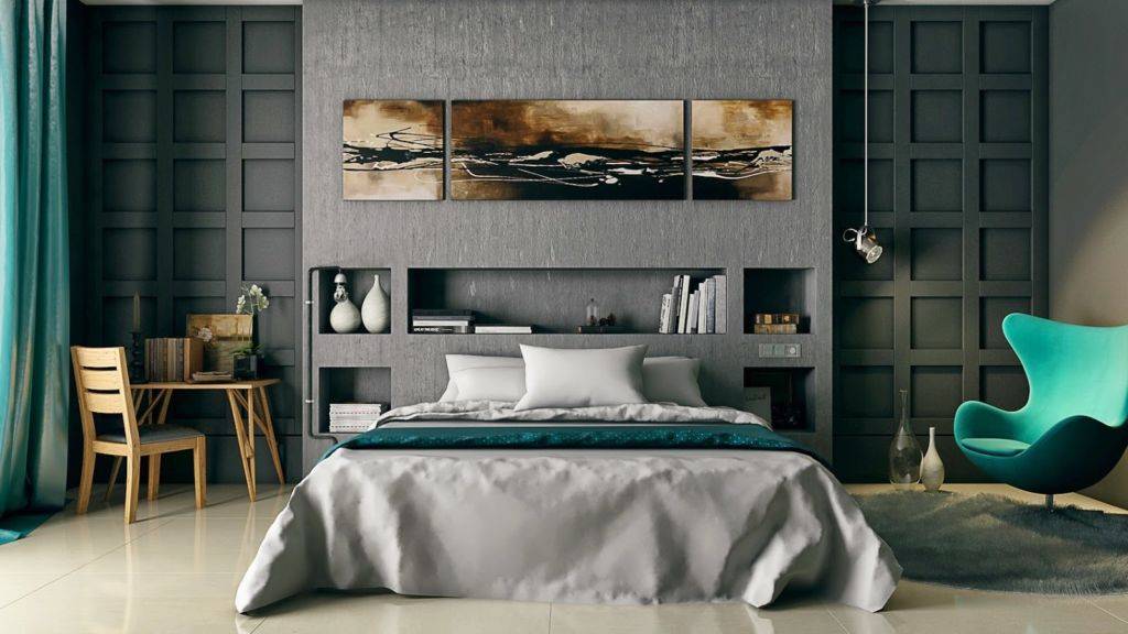 Декорирование стены у изголовья кровати в сером интерьере спальни Источник decorationinfo.ru