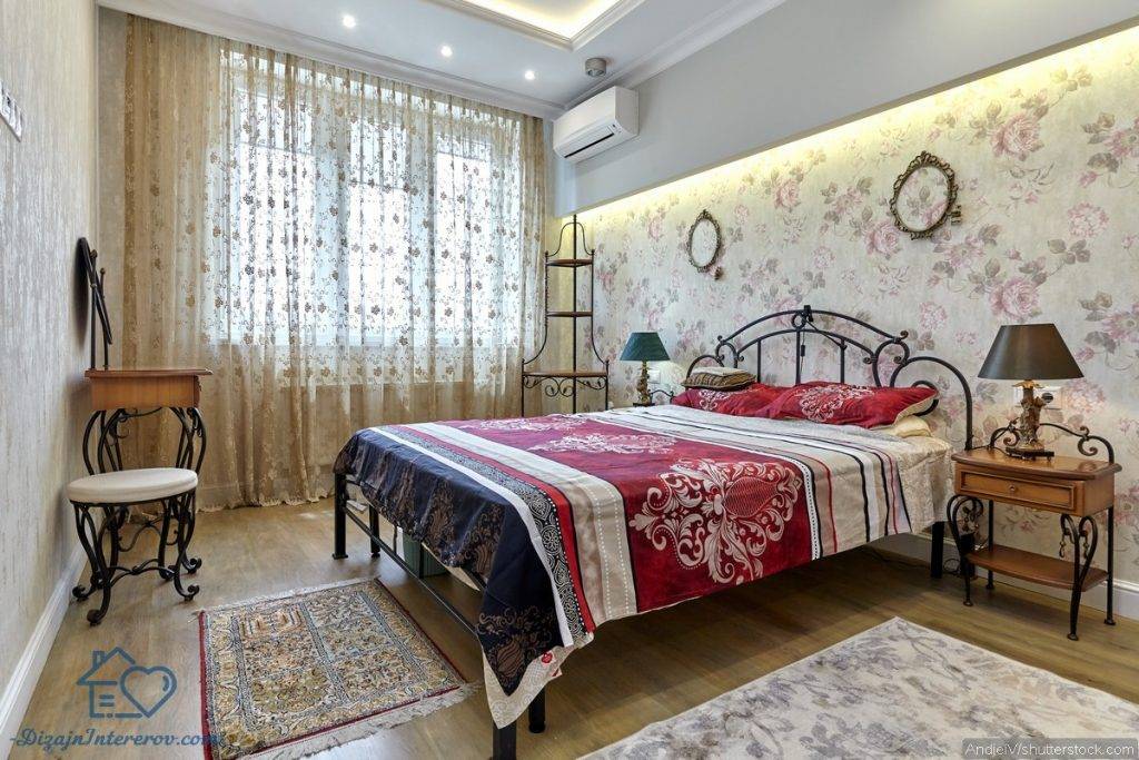 Если есть желание окунуться в старину, можно подобрать кровать с кованым изголовьем. Чтобы усилить настроение, можно также сделать напыление под старину.
