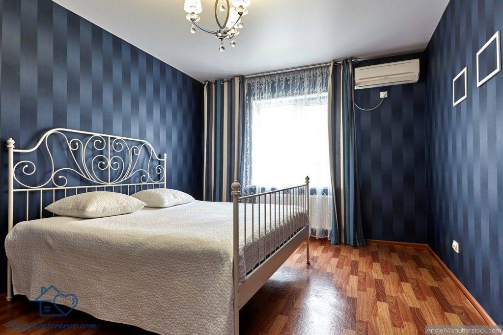 Но есть и те, кто хочет чего-то простого, хотя с обнаруживаемыми цветовыми сочетаниями только для самых детализированных. Посмотрите на картинку, и вы все поймете. Древесина кровати, рамы для картин и занавесок имеет разные оттенки синего, как и абажур. Для этого стиля необходимо использовать мебель в классическом стиле середины 20 века.