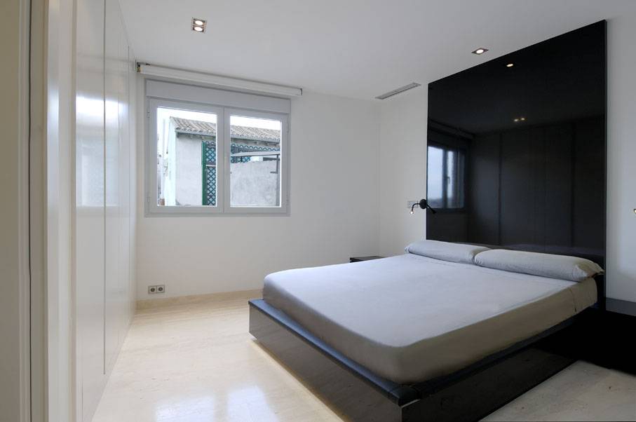 Центральное положение в любой спальне занимает кровать. В спальной комнате стиля минимализм ставят кровати-подиумы или кровати-футоны, в которых площадь матраса гораздо меньше площади основания. Если кровать установлена на стационарном подиуме, то это позволит сэкономить пространство, и создаст дополнительное место для хранения вещей.