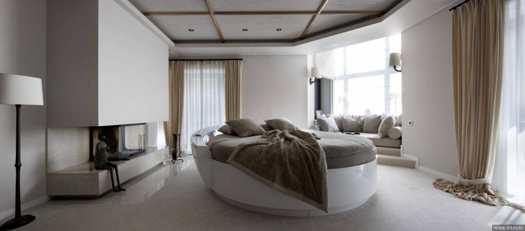 Кровать ставят на подиум или специальную платформу, куда можно встроить ящики для хранения. Ее можно дополнить балдахином.