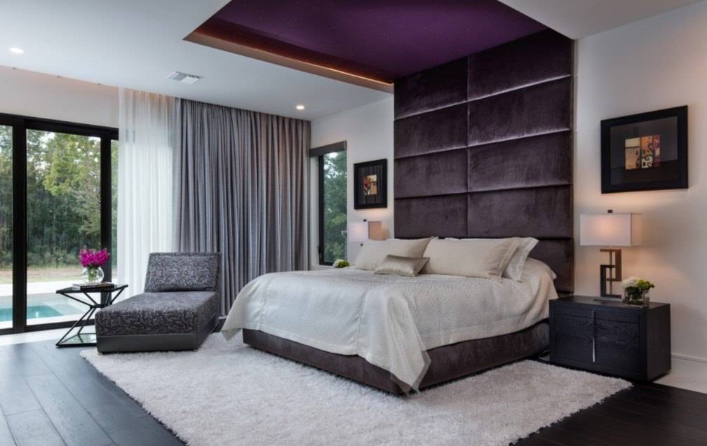 Дизайн спальни модерн, как видно на фото, характеризуется использованием преимущественно темных расцветок, смелых контрастов и мягкого, рассеянного освещения. Это небольшие лампы и фантазийные светильники. На потолке часто делается лепнина, которая добавляет роскоши всему интерьеру.