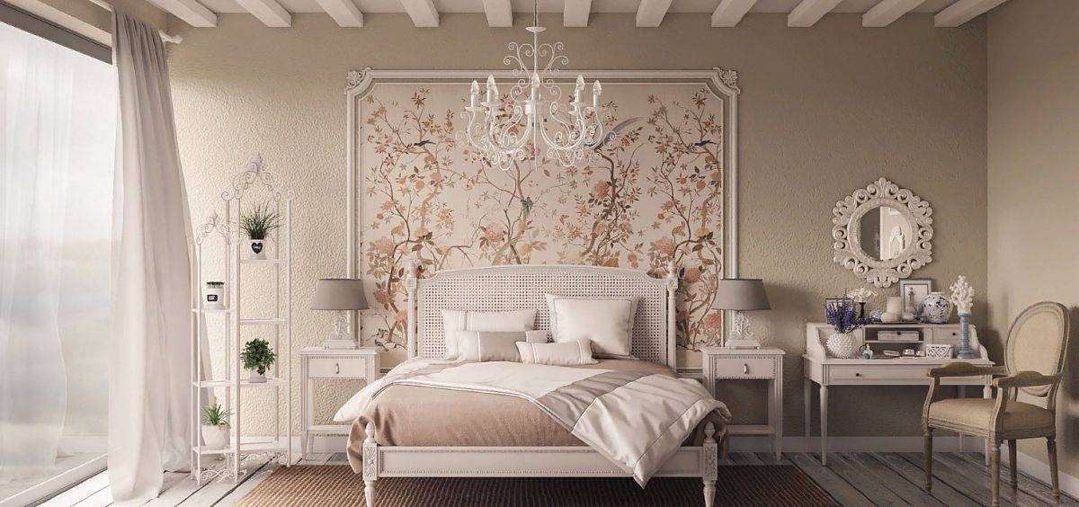 Спальни в хрущевке маленькие, и оформление их в стиле прованс нужно тщательно продумать. Стены можно оклеить обоями с изображением цветов, листьев. Если комната узкая, их лучше просто побелить. Это позволит визуально расширить пространство.