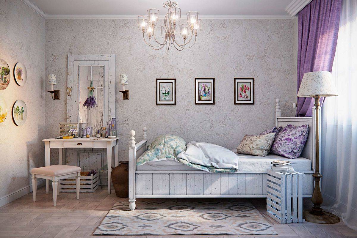 Пол в таком помещении целесообразно покрыть светлым ламинатом, отделанным под старое дерево. Он создаст уютную атмосферу. На стенах можно повесить бра, возле кровати поставить небольшую лампу с абажуром, выполненным из ситца в мелкий цветочек.