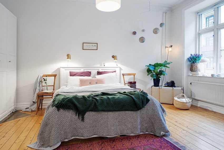 Скандинавская стилистика – это чистота, свежесть и баланс. Добиться этого эффекта позволят, прежде всего, светлые обои в спальне (белые или бледно-серые). На их фоне стильно будет выглядеть деревянная мебель с фасадами в молочных, пепельных и песочных тонах. Декор стоит подобрать в аналогичной гамме. В качестве акцентов лучше использовать комнатные растения.