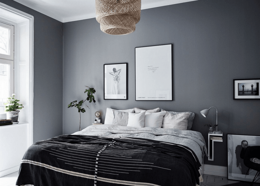 Но есть важная деталь. Если основной цвет спальни в тёмных тонах не серый, а синий или синий с чёрным, интерьер необходимо дополнять не этими же тонами ярких оттенков, а исключительно белым или зелёным. В противном случае вы рискуете получить по настоящему неудачную коробку вместо спального ложа. Фото подобной ошибки вы видите чуть выше. Если же вы снимаете квартиру с такой тёмной-претёмной комнатой, то решайтесь на изменения: