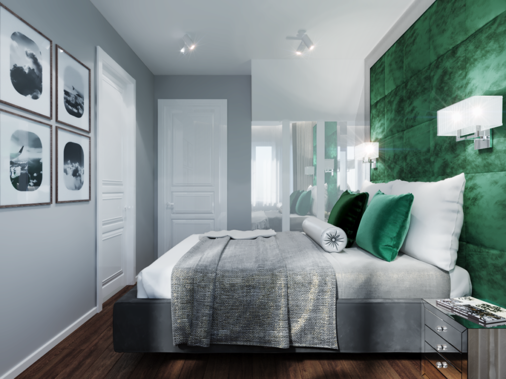 - Зелёный (яркий и насыщенный) станет пиком композиции. Используйте на кровати, декоративных подушках, ковре, вазе и пр.