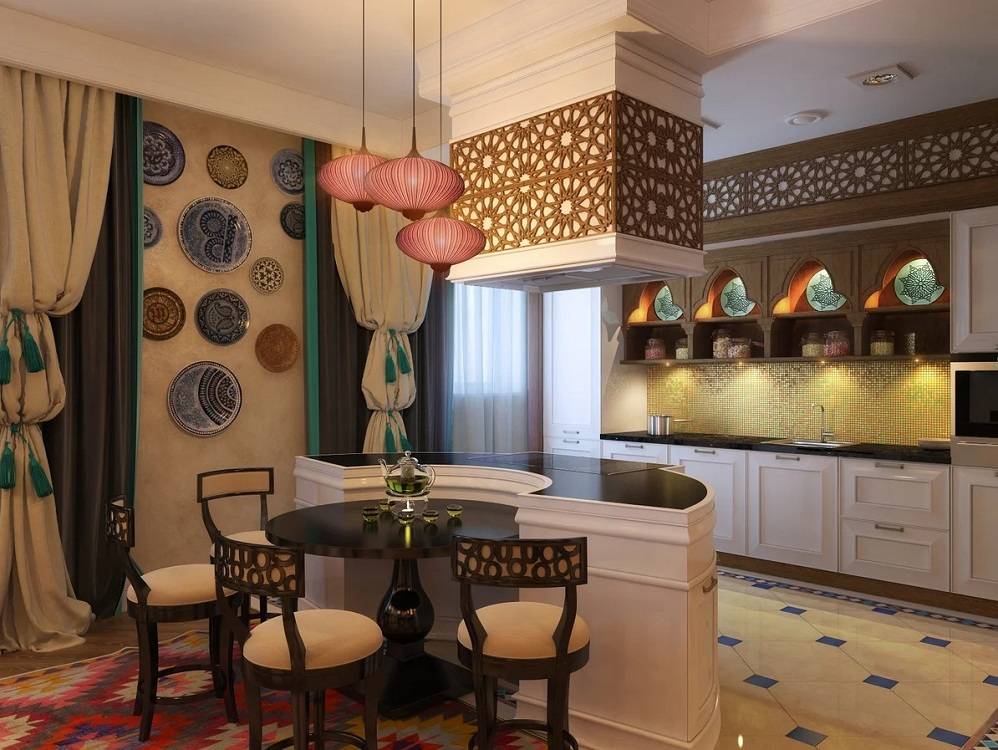 Кухонное пространство, оформляемое в таком стилевом направлении, смотрится так же богато, как и гостиная. Удачным решением становится настенная шелкография, подходит штукатурный материал «жидкий шелк». Стеновую поверхность, возле которой располагается обеденный стол. разрешается оклеить фотообоями с изображенными на них турецкими пейзажами, мечетью либо флагом. Для отделки кухонного фартука используется керамическая плитка, украшенная красивой мозаикой. Помимо этого, мозаику используют для отделки кухонной столешницы.