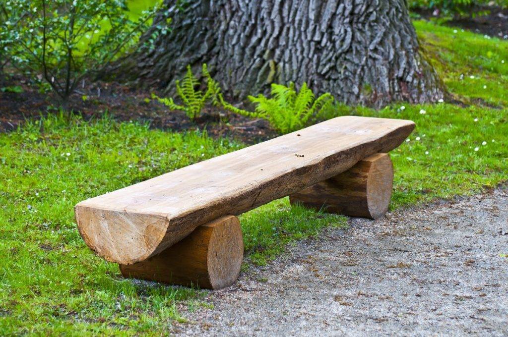 Из бревна соорудить лавочку. Ее основанием послужат бревна, которые нужно закопать в землю в выкопанные на глубину около 80 см и засыпанные песком на 10 см ямы.