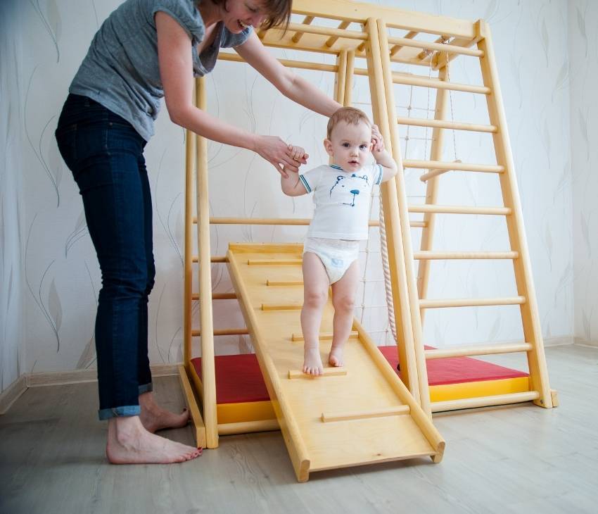 Начиная с первого года жизни малыш может с удовольствием пользоваться маленькой горкой, наклонной лестнице и качелями. С трёх лет можно установить в комнате шведскую стенку и турник, в пять-шесть лет дети могут пользоваться всеми элементами конструкции.