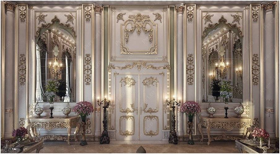Монументальность дизайна подчёркивается колоннами, арками, барельефами и пилястрами, возведёнными по принципу ордерной системы. Подобные архитектурные особенности позволяют подчеркнуть целостность и единообразие оформления, и придают интерьеру парадный облик.