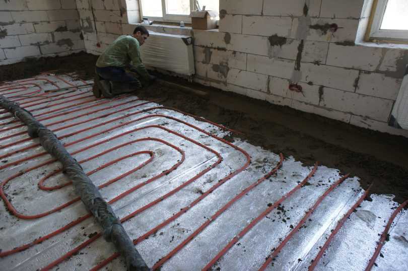 Предварительно осуществляется черновая стяжка. Она представляет собой укладку тонкого слоя бетона на начальных этапах строительных работ. Благодаря ей удается сократить расходы для отделочных материалов. Поверх неё в дальнейшем будет осуществляться подушка из теплоизоляционного слоя и нагревательного элемента. На видео стяжки пола своими руками представлена вся очередность рабочего процесса.