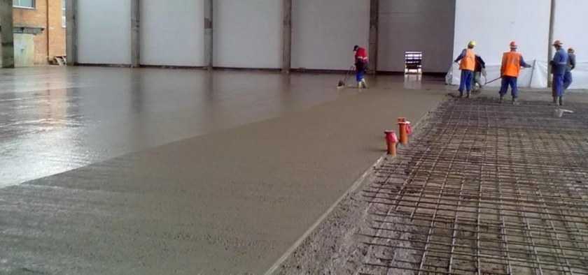 Если на бетонный пол планируются серьезные нагрузки, толщину стяжки делают не менее 12 см плюс усиленное армирование. Дополнительно применяется и «топпинг» — увеличение прочность бетона на сжатие на целых 100 МПа.
