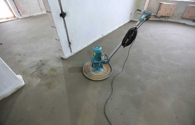 Для работы используют длинный строительный шпатель и уровень. Благодаря им удаётся равномерно распределить бетонный раствор по всей площади помещения. Чтобы на бетонном основании не образовывались мелкие пузырьки их удаляют при помощи веника или метлы с пластиковой щетиной.