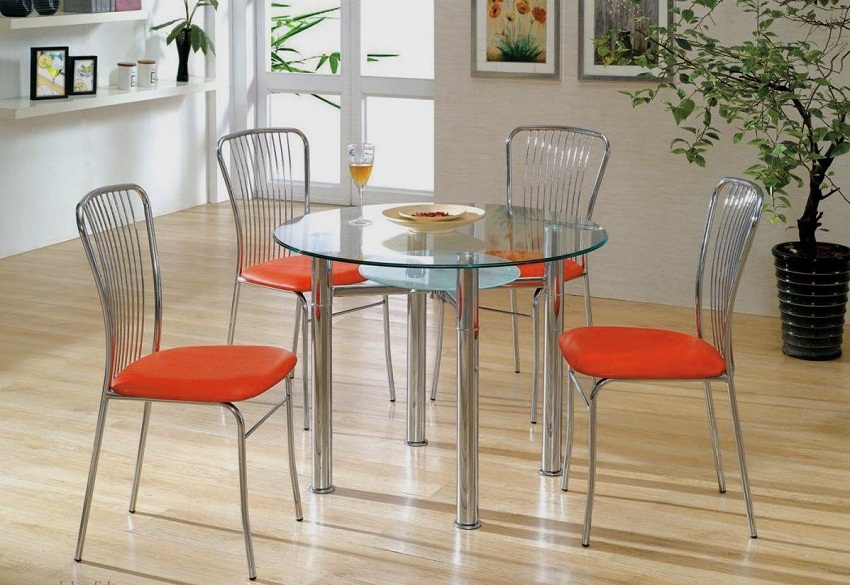 Одним из наиболее распространенных вариантов стеклянной мебели, является обеденный стол. Наибольшую актуальность он приобретает в небольших кухнях. Даже огромная стеклянная столешница не будет смотреться громоздко в маленьком помещении. Будет очень хорошо, если его каркас будет из такого же материала, как и основа стульев. Если вы купите вариант с матовой поверхностью, то избавите себя от лицезрения ног сидящих рядом с вами людей. Чтобы избежать звона ложек и стаканов на стеклянном столе, рекомендую использовать мягкие салфетки или специальные подставки.