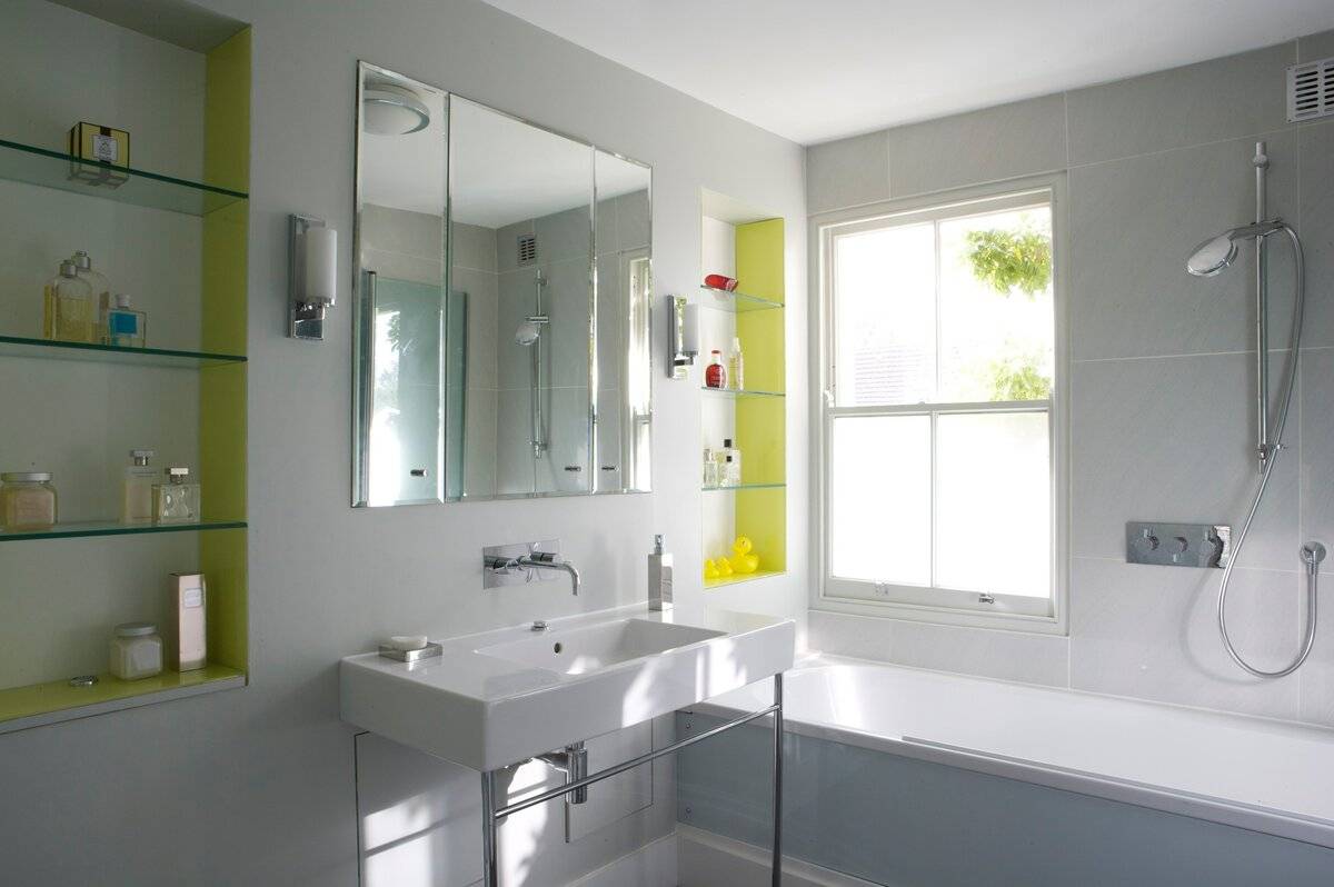 Ванная комната с полками: стиль и манера исполнения