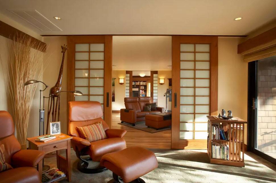 Как часть интерьера, раздвижная перегородка поддерживает общую концепцию дизайна и часто является основным направлением. Для таких дверей используются различные декоры с рисунками на стекле и фактурными декоративными накладками.