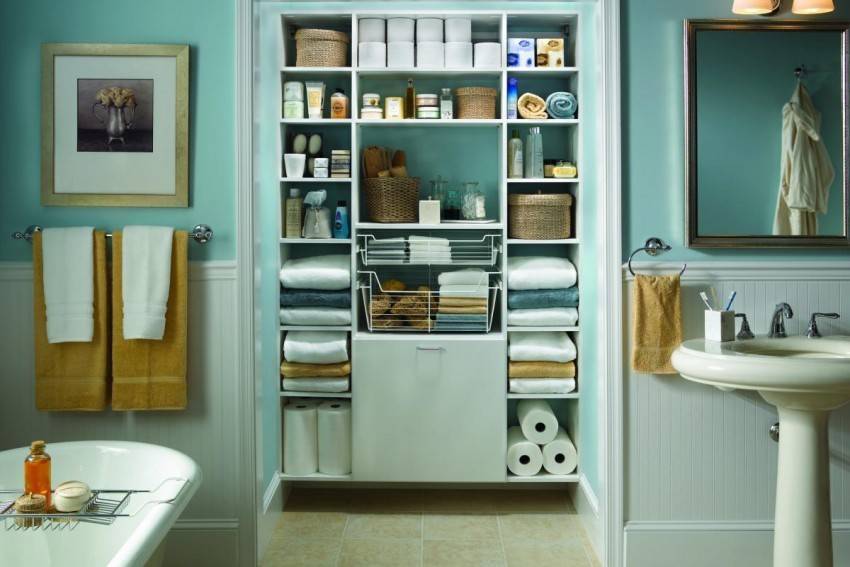Для шкафа в ванную не потребуется сложной системы хранения. Лишь самое элементарное: