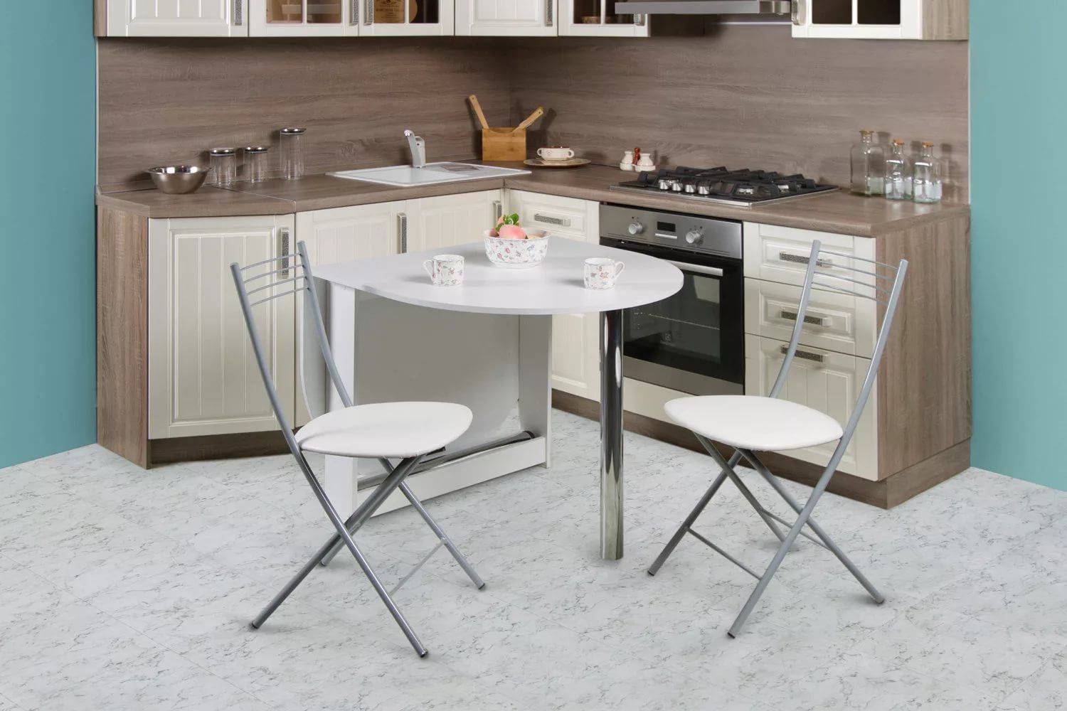 Треугольный. Довольно редкий вид кухонного стола, который, как правило, изготавливают на заказ. Это довольно необычное решение бывает единственно возможным для очень маленьких кухонь или комнат со сложной архитектурой.