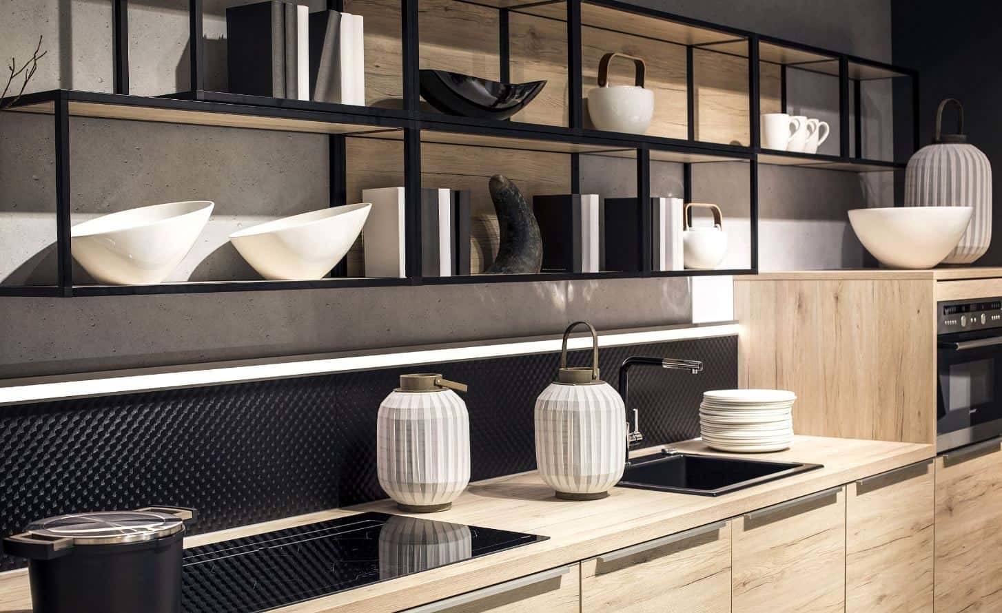 В небольшом кухонном пространстве, наиболее уместны пристенные модели или компактные варианты, которые могут представлять собой мобильную конструкцию на колесиках, для хранения посуды. В просторной кухне можно установить винный стеллаж или изделие, представляющее собой разграничитель между рабочей и обеденной зоной.