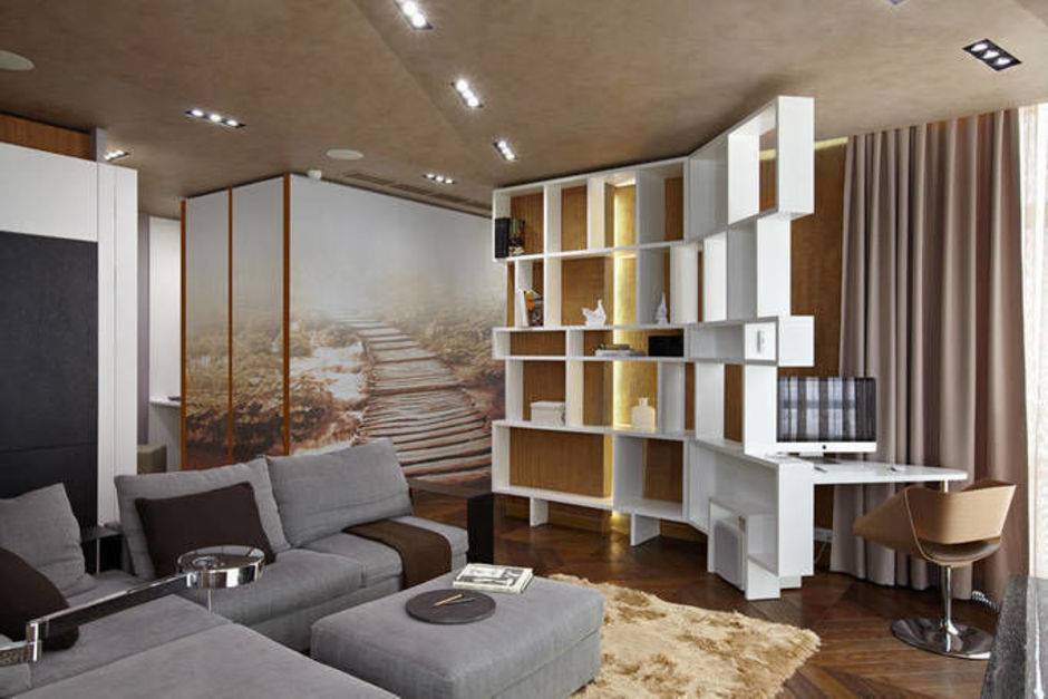 Это прекрасная возможность сделать в комнате четкие, почти изолированные функциональные зоны. Причем совсем не обязательно устанавливать высокую, почти достающую потолок, перегородку. Она помогает создать реалистичную иллюзию раздельных комнат или надежно закрывает определенный участок комнаты, к примеру, когда в просторной гостиной выделяется место для сна.