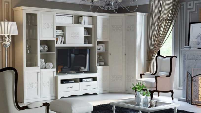 Популярный вариант, как для просторных гостиных, так и для залов с ограниченным пространством. С помощью гарнитура можно выигрышно обыграть даже узкую, удлиненную комнату. Угловой платяной шкаф или книжный стеллаж под потолок визуально расширит пространство. По бокам от него уместно разместить узкие тумбы и негромоздкие навесные открытые и закрытые модули.