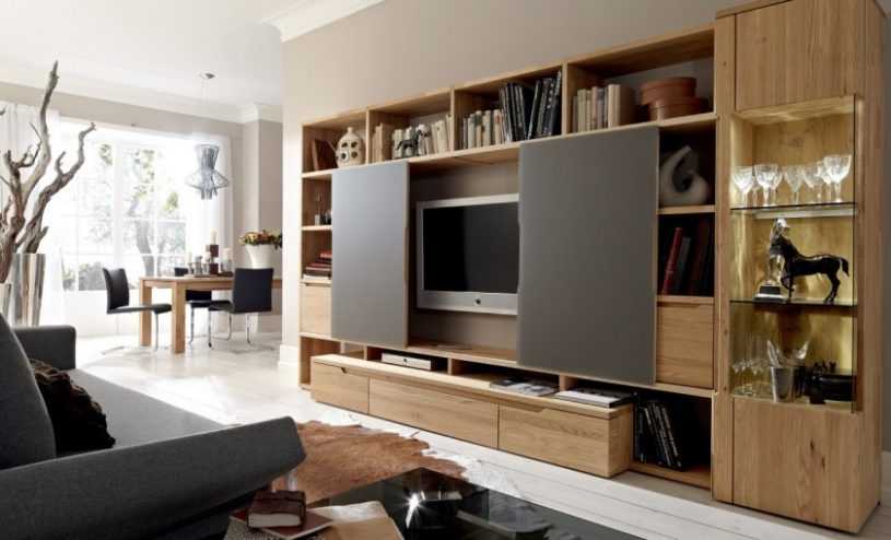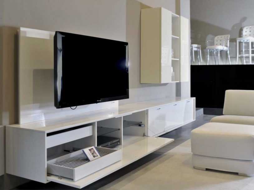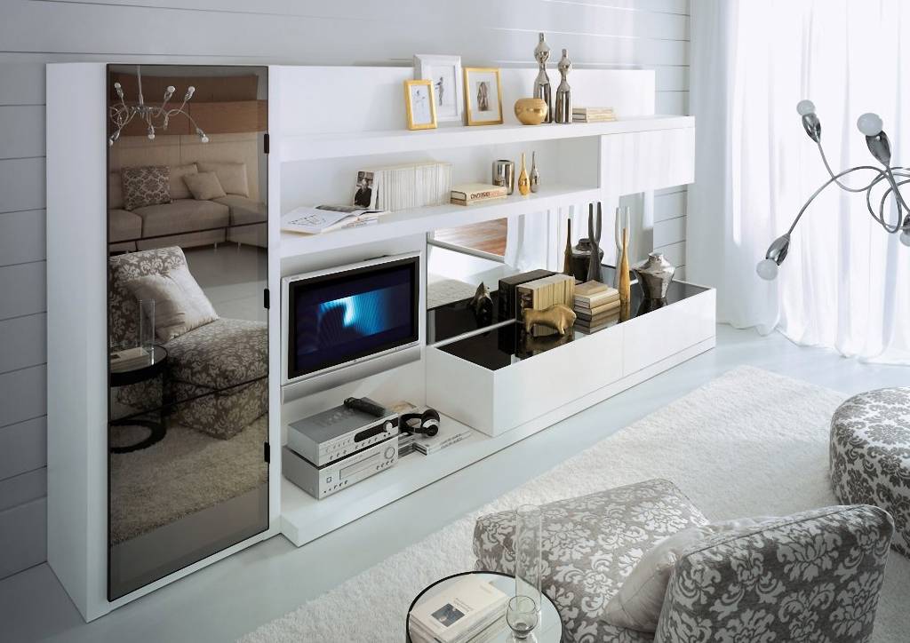 Также такая мебель может понадобиться для размещения разного рода техники в гостиной. В этом случае нужно позаботиться о том, чтобы она включала в себя большое количество вместительных полок, на которых можно будет разместить DVD, приставки и прочее.