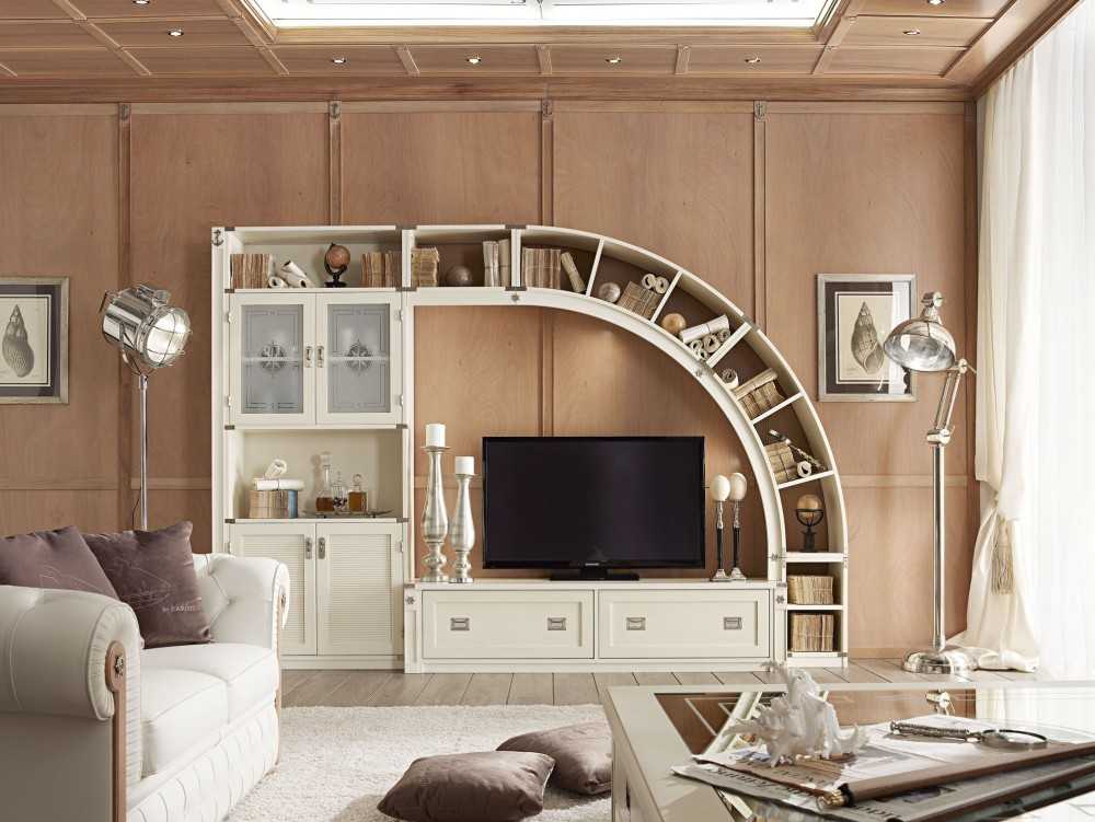 На фото – большие стенки в гостиную с глубокими радиусными шкафами.