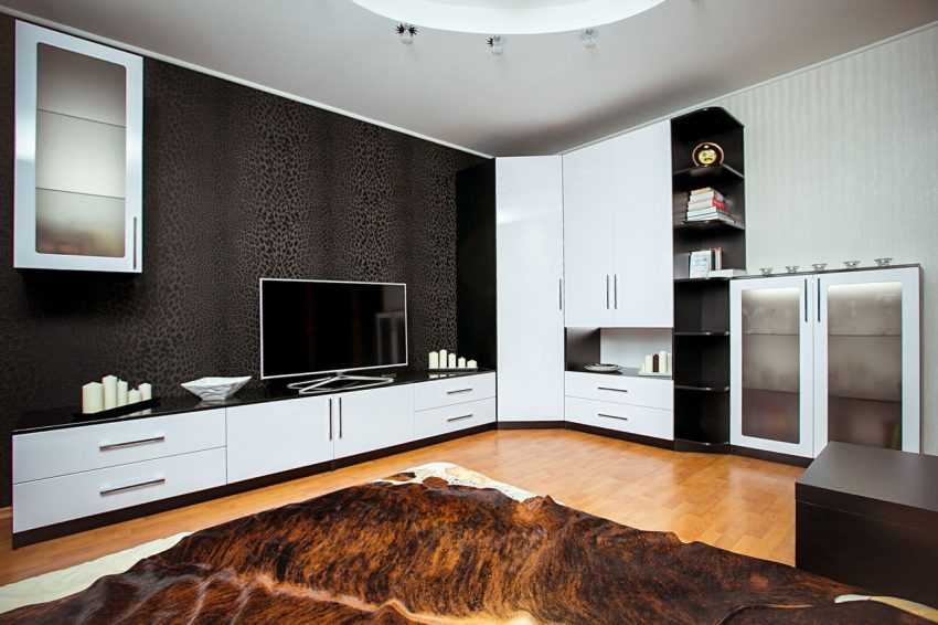 Угловая стенка способна скрыть дефекты в углу гостиной, так как именно этот угол чаще всего подвергается размножению грибка и плесени из-за частого перепада температур. Она может быть корпусной, модульной и даже купе.