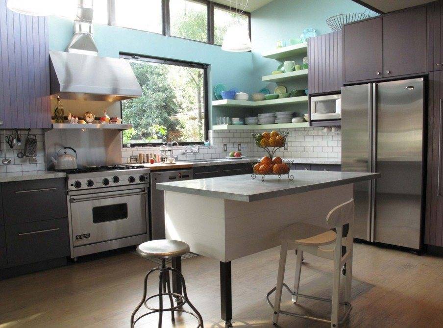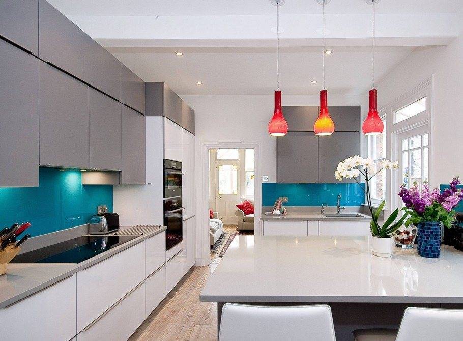 Если было решено оформить помещение в современном стиле и не использовать навесные шкафчики, то фартук все равно необходимо оформить, так как поверхность стены нуждается в защите от попадания брызг жира и различных жидкостей. Можно отделать только часть над столешницей, минимальная высота фартука должна быть 60 см, но можно и больше. Что касается материалов, стоит разобрать некоторые интересные решения.