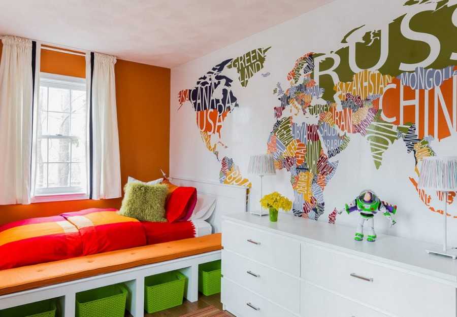 Изображение материка, карта мира или же страны – также интересный вариант акцентной стены. Можно изобразить карту придуманного мира или несуществующего королевства, если у ребёнка бурно развиты фантазия и воображение.