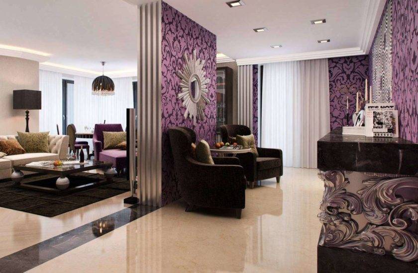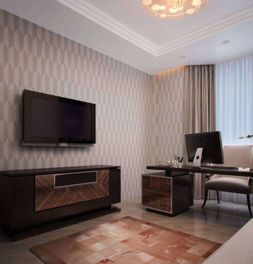 Если на первый план хочется вынести дорогую мебель, то стены оформляются проще и выступают фоном.