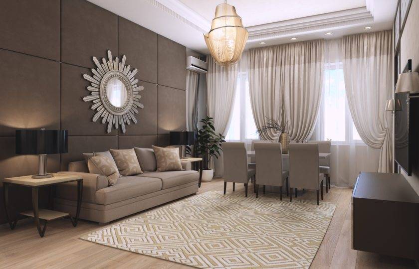 Многие предпочитают в таких комнатах некоторое осветление. Поэтому в идеале будет дополнить гостиную бежевым, кремовым или кофейным тоном. Его обычно применяют для отделки стен и потолков. Иногда он встречается и в декоре.