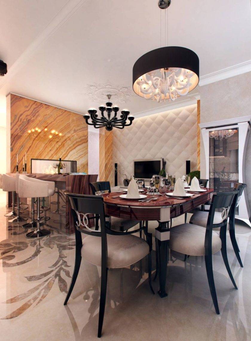- Роскошные отделочные материалы. Стены в Арт-деко — это целое искусство. Их расписывают этническими узорами, создают симметричные композиции, украшают картинами, предметами экзотической тематики и яркими акцентами. Для пола идеальными вариантами являются полированный мрамор и гранит. Потолок традиционно белый, но не лишен современных возможностей освещения.