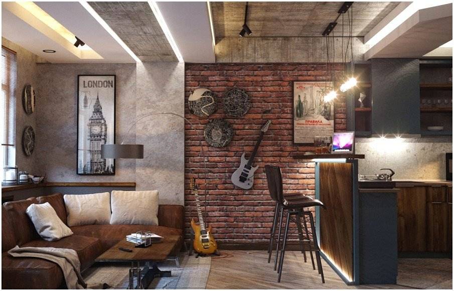 И если в период зарождения течения поверхности стен старались выполнять гладкими и ровными, то сегодня преобладают неоштукатуренные поверхности, цветовая палитра наполнена темными оттенками, а элементы декора достаточно практичны.
