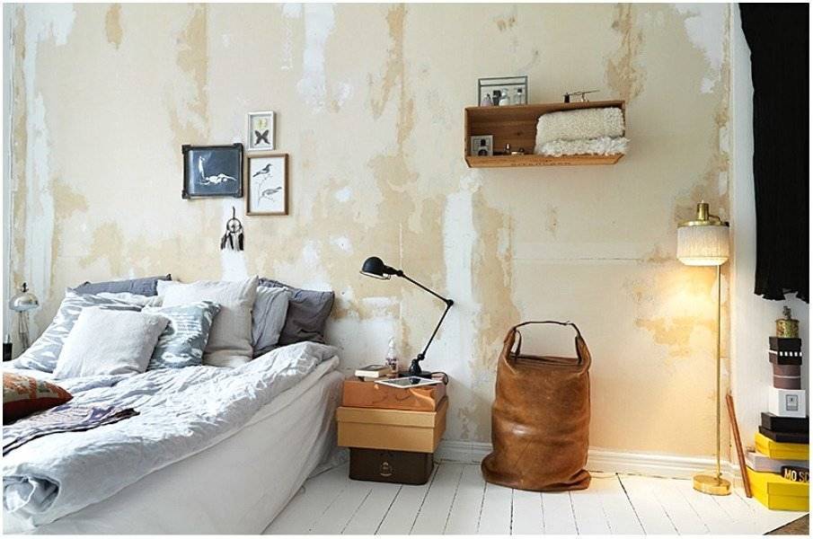 Можно также выбрать различную отделку для разных стен. Например, расположенную в изголовье кровати, можно покрыть бетоном. Идеально если она будет с неровностями, подчеркивающими «небрежность», с которой вы отнеслись к осуществлению ремонта в своей квартире.