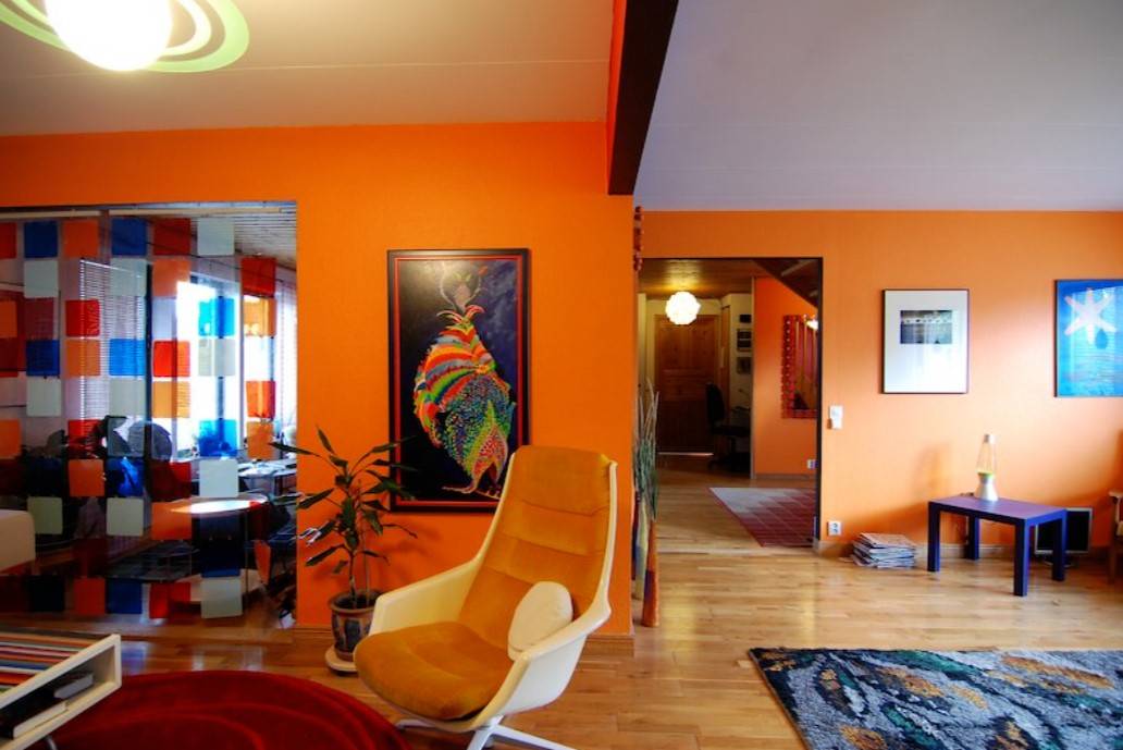 Цветовая гамма умышленно беспорядочна. В интерьере одной комнаты соседствуют красные, фиолетовые, желтые тона самых невероятных оттенков с пасторальными нежными мотивами.