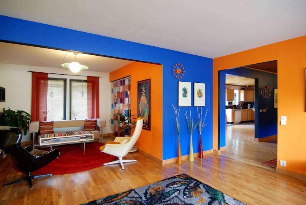 • Главные цвета в интерьере — нейтральных оттенков (серый, черный, белый и бежевый). В некоторых случаях эксперты могут находить уместным использование полутонов этих оттенков. Одна из характерных особенностей современного дизайна — присутствие акцентного пятна (яркая мебель или выделенная обоями необычного цвета одна из стен).