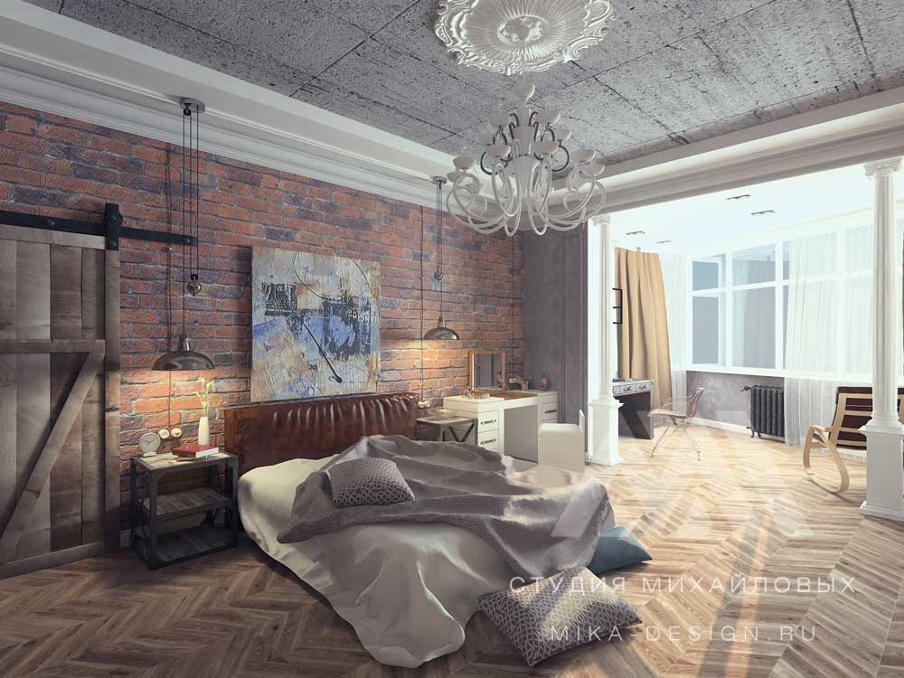 Стиль лофт в спальне — это самая «больная» тема. По идее спальня должна быть открытой. Но мало кто соглашается на такие эксперименты. В остальном — стены (или одна стена) грубой обработки, на полу — ковер и шикарная кровать. Из обстановки все. Если нужен шкаф, он может прятаться за дверью, которая на фоне стены может быть и незаметной.