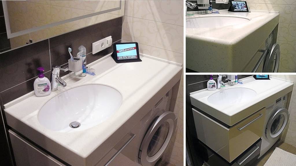 Преимущество отводиться готовому комплекту под стандартную модель стиральной машины с раковиной-кувшинкой. Но установка осуществима только, если ванная комната больше 6.0 кв.м. В противном случае, столешницу с врезной раковиной изготавливают самостоятельно или под заказ.