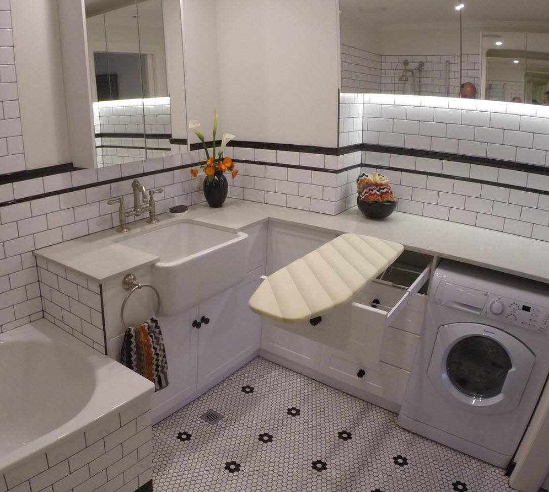 стиральная машинка под столешницей неправильной формы. Это, наверное, одно из самых гениальных решений для маленькой ванной комнаты. В то же время подобный способ позволяет проявить фантазию и учесть конфигурацию вашей ванной комнаты. Суть идеи заключается в том, чтобы сделать столешницу неодинаковой по всей ширине. В месте над машинкой она может быть широкой, а потом постепенно сужаться (хорошо видно на фото). Чем же интересно данное решение? Тем, что удается максимально гармонично вписать стиральную машину (она полностью скрыта столешницей) и при этом за счет сужения столешницы получить больше пространства для свободного перемещения, чтобы никто не бился об углы в попытках развернуться в ванной комнате скромных размеров.