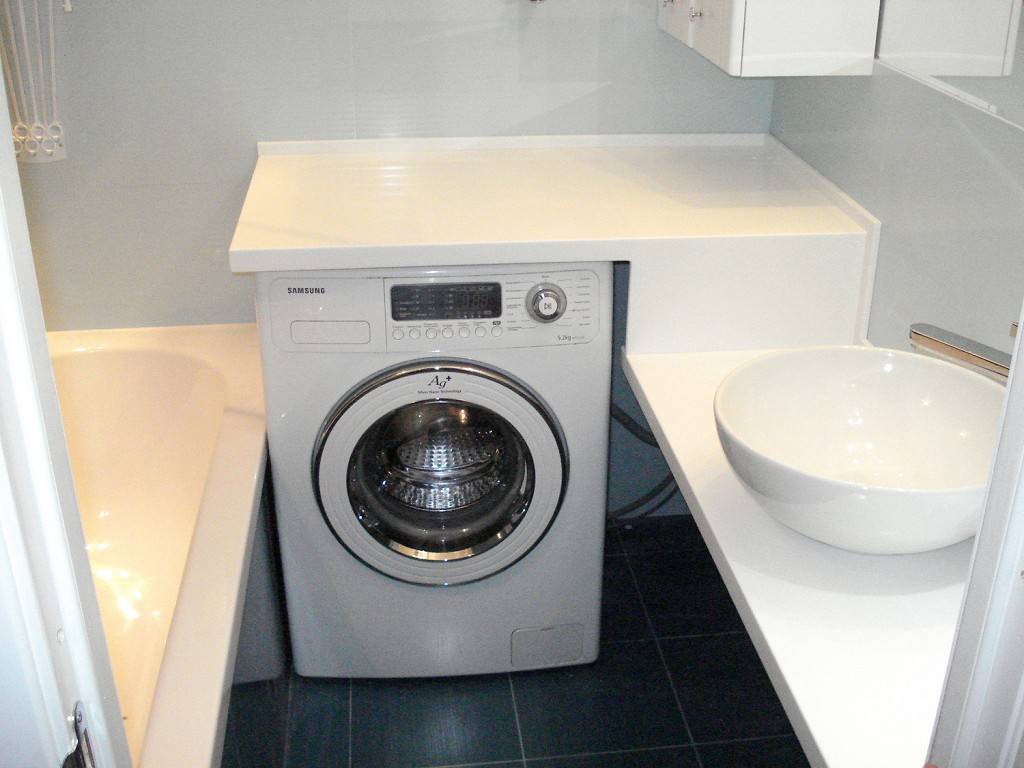 В ванной комнате обычно используют классический тип стиральных машинок или встраиваемых под съемную столешницу: