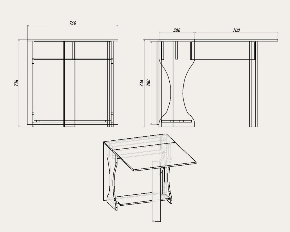 Складное изделие является подобием небольшой компактной тумбы, которую при некоторых обстоятельствах возможно превратить в относительно вместительный обеденный стол, причём, не прилагая абсолютно никаких усилий. Размер площади обеденной столешницы меняется и напрямую зависит от откидных сторон. То есть по потребностям можно открыть одну, либо обе панели.